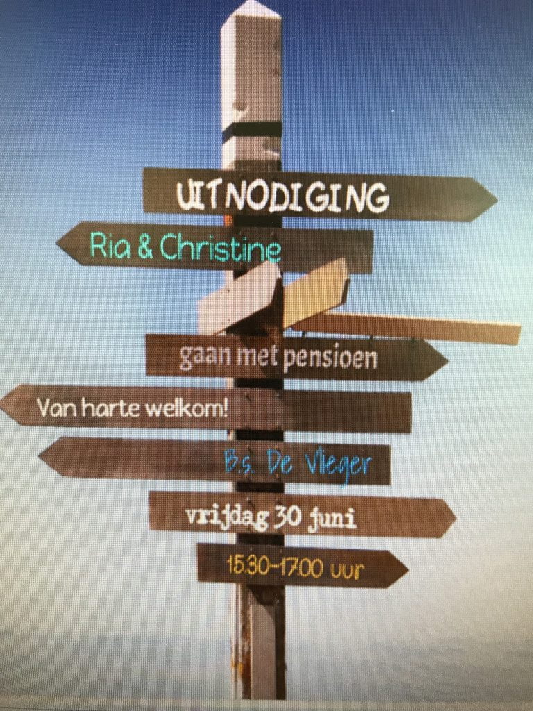 Aanstaande vrijdag 30 juni 2017 nemen twee leerkrachten van basisschool De Vlieger in Volkel na vele jaren trouwe dienst afscheid van het onderwijs. Die dag zal er naast een feestdag voor en met de kinderen ook een receptie zijn voor genodigden om de jubilarissen de hand te schudden. Naast genodigden zijn ook mensen uit Volkel en directe omgeving van harte welkom om juffrouw Ria en Christine te feliciteren met deze mijlpaal.