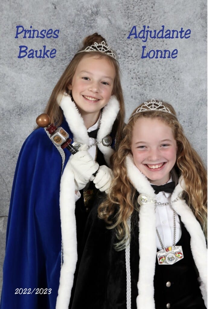 Jeugdprinses Bauke Verbruggen is 11 jaar oud. “Ik woon in de Liessentstraat op Lankes samen met papa Edwin, mama Lea, mijn zusje Bregje, onze hond Guusje en mijn 2 wandelende takken Lily en James. Ik ga naar basisschool de Vlieger en zit in groep 8. Ik speel tennis bij TC Volkel en volg pianoles bij Ieke. Ik houd van lezen, chillen met vriendinnen, spaar alles van Harry Potter en knuffel heel graag met Guusje.”