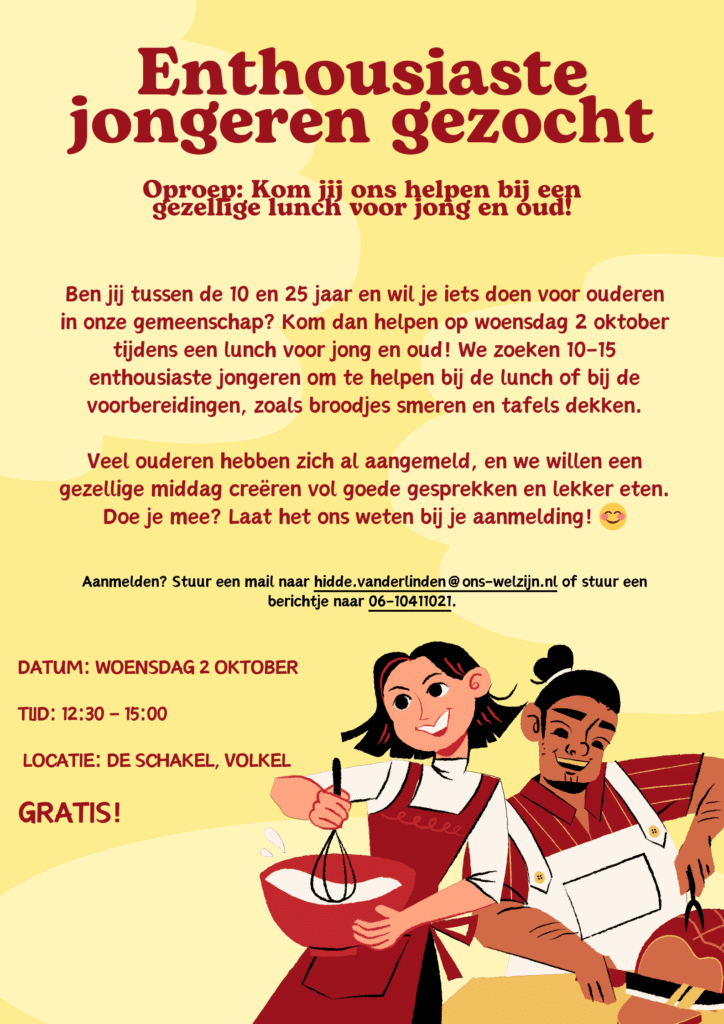 Er hebben zich al veel ouderen aangemeld, en we willen graag een verbindende middag creëren waar jong en oud samenkomen. Als jongere kun je helpen bij het verzorgen van de lunch of gezellig samen met de ouderen genieten van een lekker hapje en een goed gesprek.