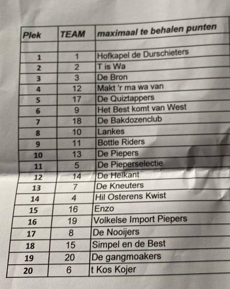 Op 19 november j.l. hadden we eindelijk na 4 jaar weer eens een echte Volkelse kwis. Hieraan hebben 20 teams deelgenomen die streden om de felbegeerde wisselbeker en die zich 2 jaar lang het slimste team van Volkel mag noemen. Alle teams hebben de verschillende opdrachten zo goed mogelijk uitgevoerd en voor elk onderdeel hun beste mensen ingezet om een zo hoog mogelijke score te behalen. In totaal zijn er 475 mensen die avond bezig geweest met de kwis die om 23 uur werd afgesloten waarna voor de commissie het nakijken en optellen kon beginnen en voor de teams het lange wachten op de uitslag.