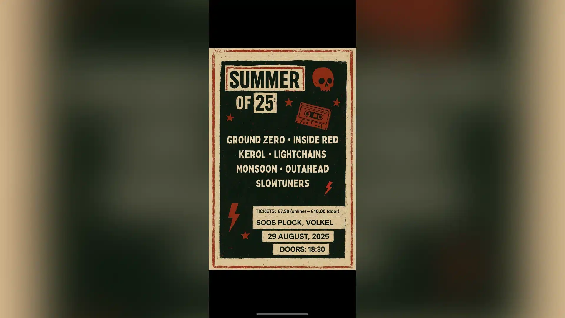 De band Ground Zero presenteert dan vanaf 18.30 uur Summer of ‘25 met optredens van Ground Zero zelf, maar ook Inside Red, Kerol, Lightchains, Monsoon, Outahead en Slowtuners. Het programma biedt een mix van rock tot grunge, punk en nu-metal.